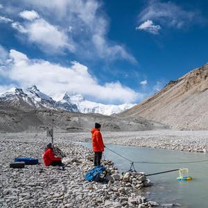 在珠峰登山大本營(yíng)附近,科考隊員測量絨布河水流速(5月22日攝)。