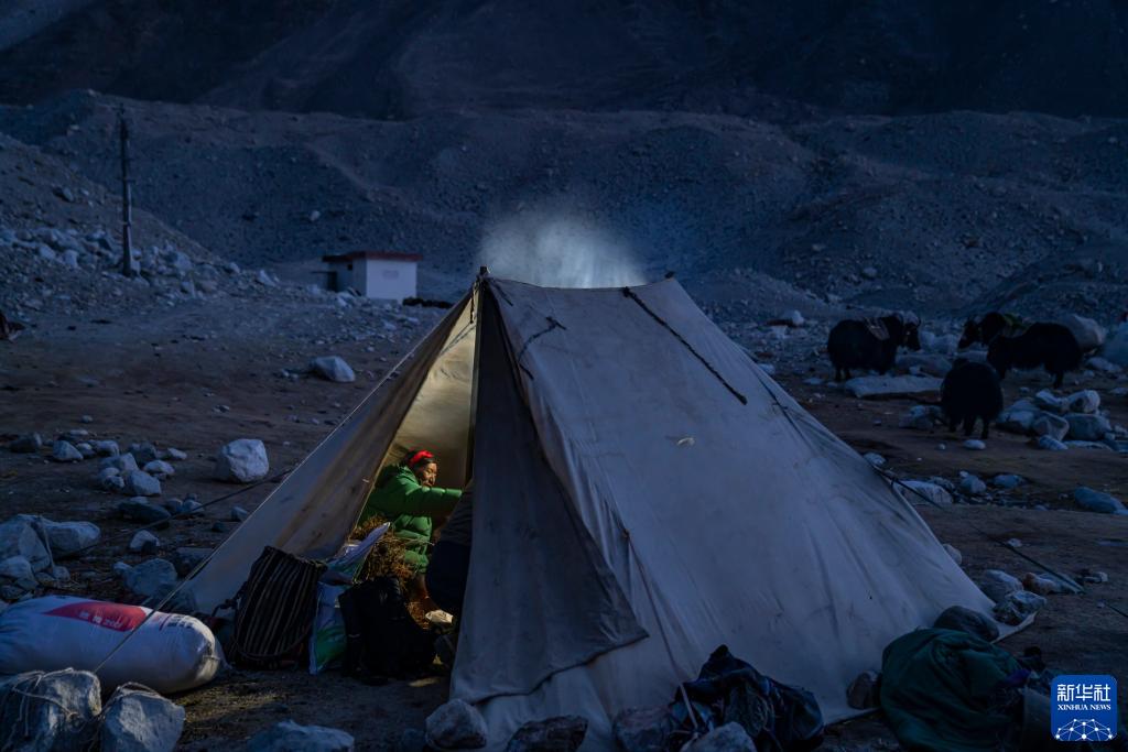 馱運物資上山的前夜,牦牛工在珠峰登山大本營(yíng)附近的帳篷里休息(5月17日攝)。