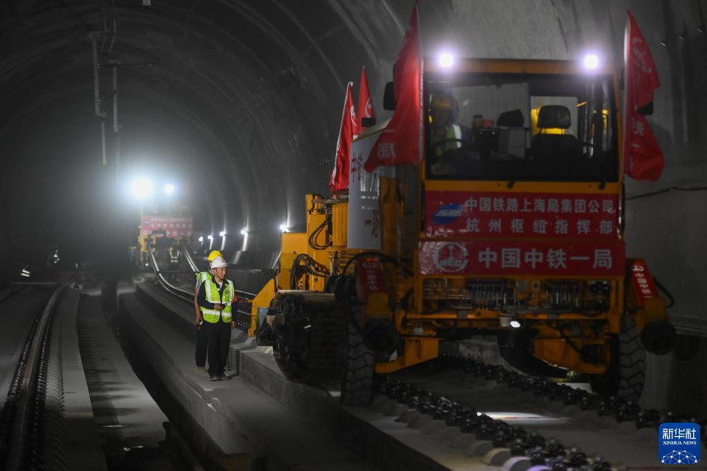 5月22日,中鐵一局建設者在金甬鐵路樓勝隧道內進(jìn)行鋪軌作業(yè)。