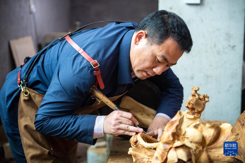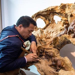 洞口木雕發(fā)祥于湖南省邵陽(yáng)市洞口縣,歷史悠久,上個(gè)世紀80年代以來(lái),洞口木雕產(chǎn)品遠銷(xiāo)海外。傅立先是洞口木雕非遺傳承人,他的爺爺傅滿(mǎn)山和父親傅金林曾是木雕工藝廠(chǎng)的老師傅。近年來(lái),傅立先對洞口木雕的創(chuàng )作方向進(jìn)行新的探索,把傳統工藝與現代文化相結合,創(chuàng )作出很多精美的木雕作品。