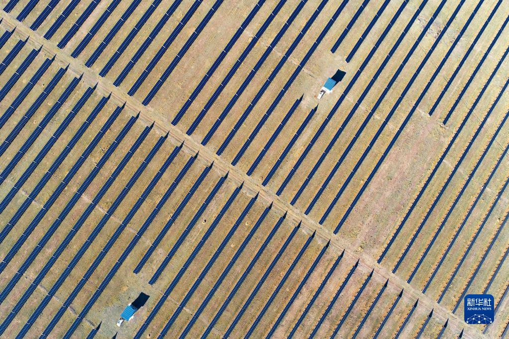 5月23日拍攝的興安盟烏蘭浩特市呼和馬場(chǎng)風(fēng)力光伏發(fā)電場(chǎng)內的光伏板(無(wú)人機照片)。