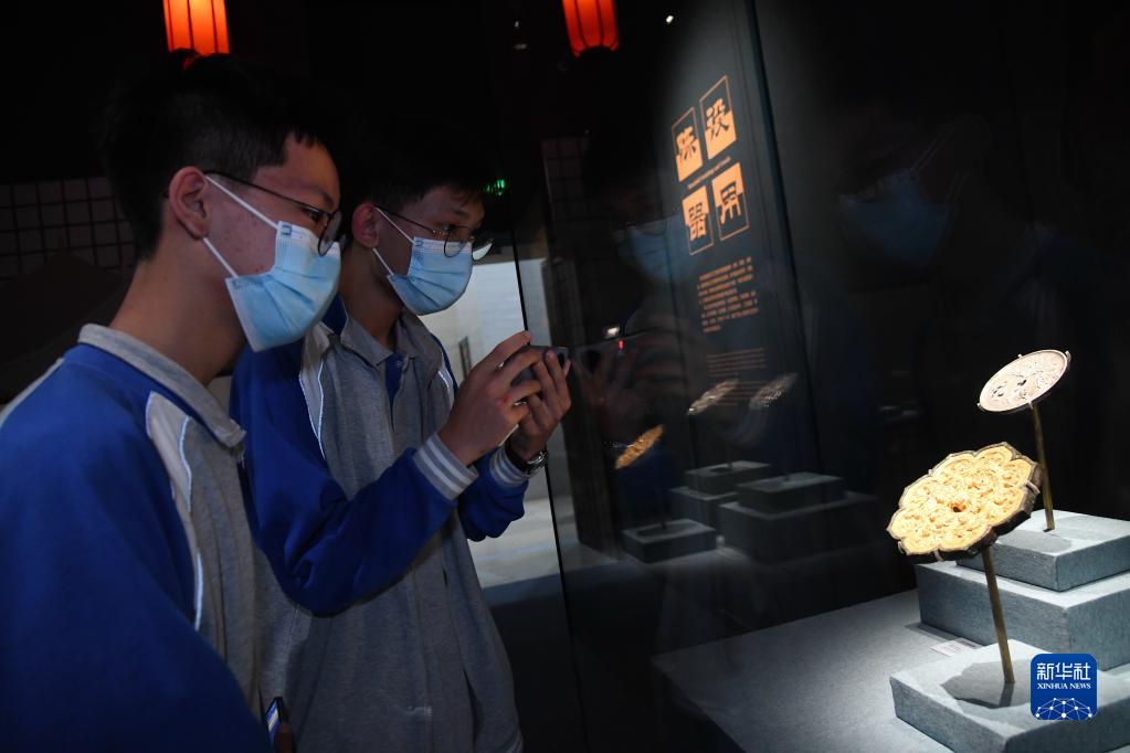 5月22日晚,游客在西安博物院《長(cháng)安有故里——絲路少年大唐行》展覽上參觀(guān)。