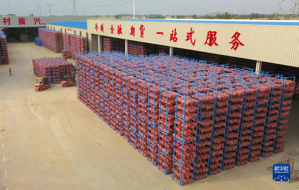 5月23日,在山東省巨野縣陶廟鎮一家經(jīng)營(yíng)大蒜倉儲業(yè)務(wù)的公司,大量大蒜將被放入冷庫儲存(無(wú)人機照片)。
