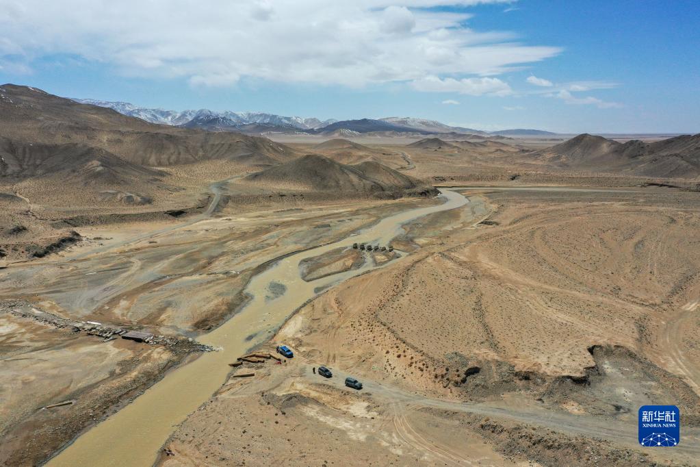 科考隊員在新疆東昆侖庫木庫里盆地古爾嘎赫德河進(jìn)行水文巡測工作(5月22日攝,無(wú)人機照片)。