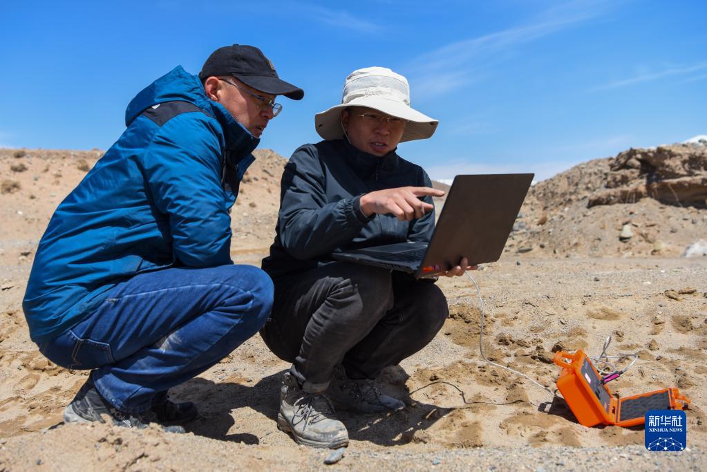 科考隊員在新疆東昆侖庫木庫里盆地核對水流數據(5月22日攝)。