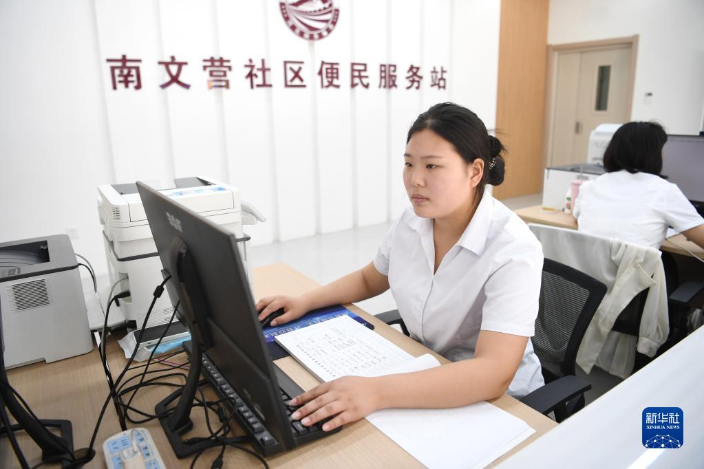 河北雄安新區容東片區南文營(yíng)社區便民服務(wù)站工作人員在工作(5月23日攝)。