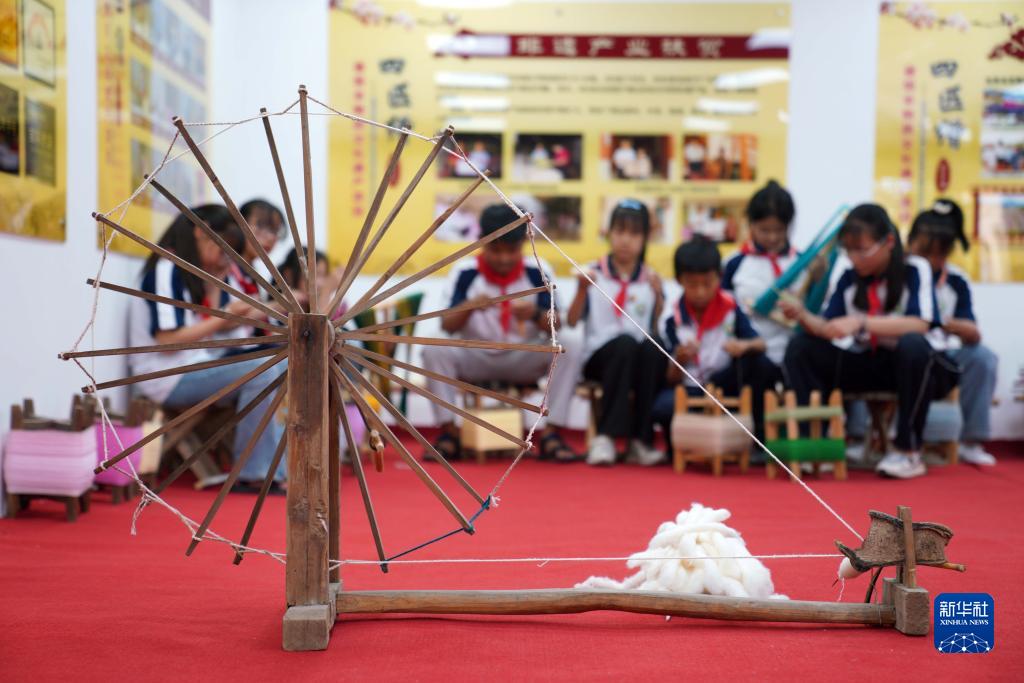 5月24日,小學(xué)生在河北省沙河市塔子峪村非遺傳習所內體驗四匹繒布制作技藝。