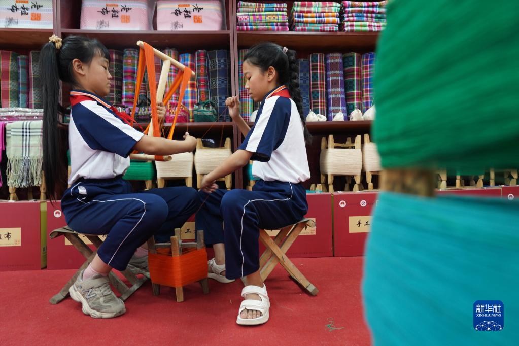 5月24日,小學(xué)生在河北省沙河市塔子峪村非遺傳習所內體驗四匹繒布制作技藝。