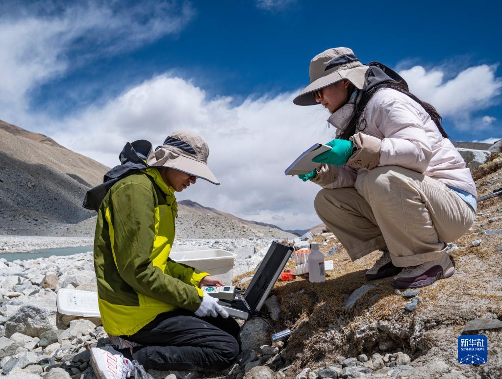 在珠峰登山大本營(yíng)附近,來(lái)自西藏大學(xué)生態(tài)環(huán)境學(xué)院的科考隊員在測量土壤溫度(5月22日攝)。