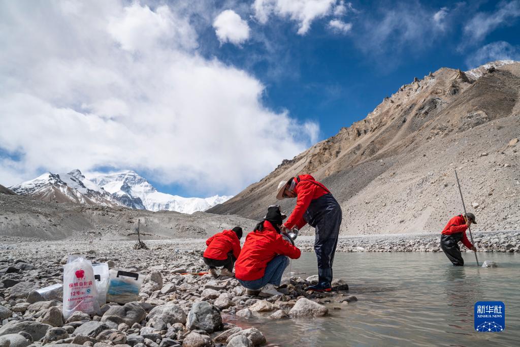在珠峰登山大本營(yíng)附近,來(lái)自西藏大學(xué)生態(tài)環(huán)境學(xué)院的科考隊員在進(jìn)行水生態(tài)調查(5月22日攝)。