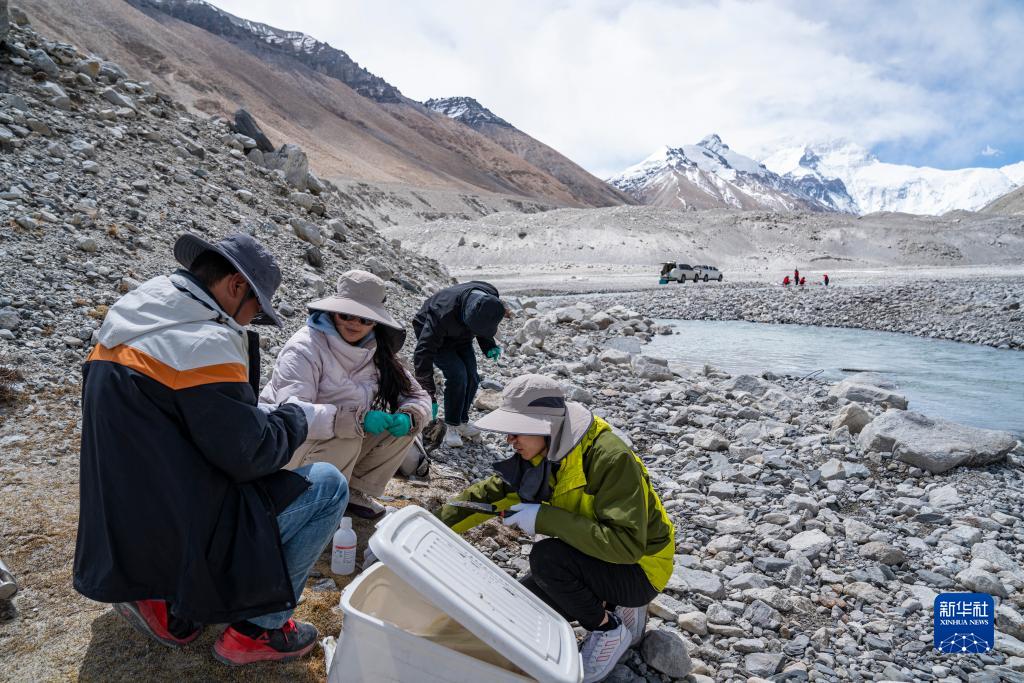 在珠峰登山大本營(yíng)附近,來(lái)自西藏大學(xué)生態(tài)環(huán)境學(xué)院的科考隊員在收集土壤樣本(5月22日攝)。