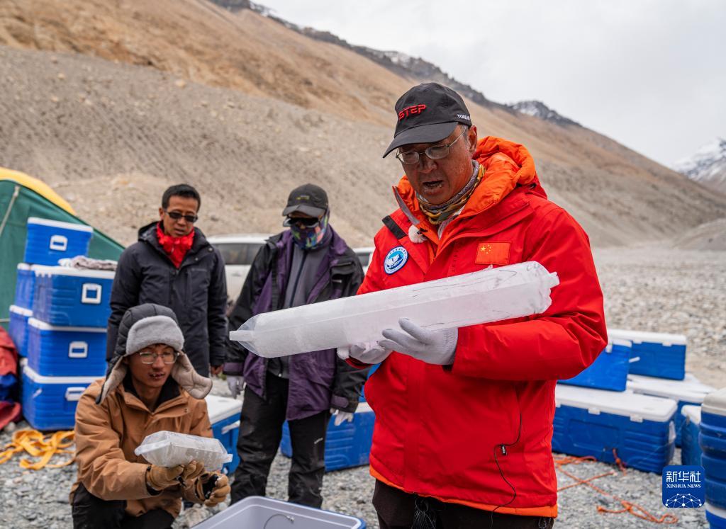在珠峰登山大本營(yíng),中國科學(xué)院西北生態(tài)環(huán)境資源研究院副院長(cháng)康世昌(右)在查看從珠峰海拔約6500米處鉆取的冰芯樣品(5月22日攝)。