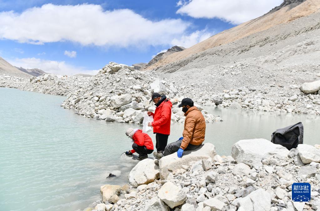 在珠峰海拔約5300米處,來(lái)自中國科學(xué)院青藏高原研究所的科考隊員在用水質(zhì)儀檢測冰前湖水質(zhì)(5月12日攝)。