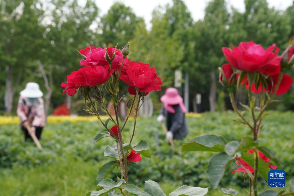 5月24日,工人在河北省沙河市冶鐵文化園養護綠地。