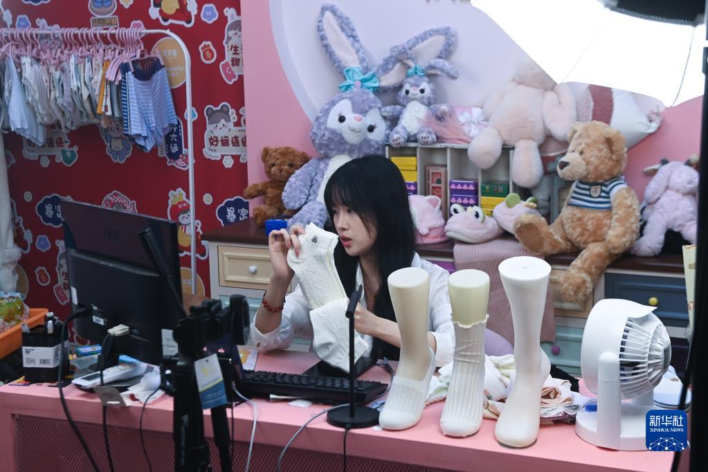 5月25日,在位于浙江省諸暨市大唐街道的浙江阿大互聯(lián)科技股份有限公司的襪業(yè)直播基地內,工作人員在進(jìn)行直播銷(xiāo)售。