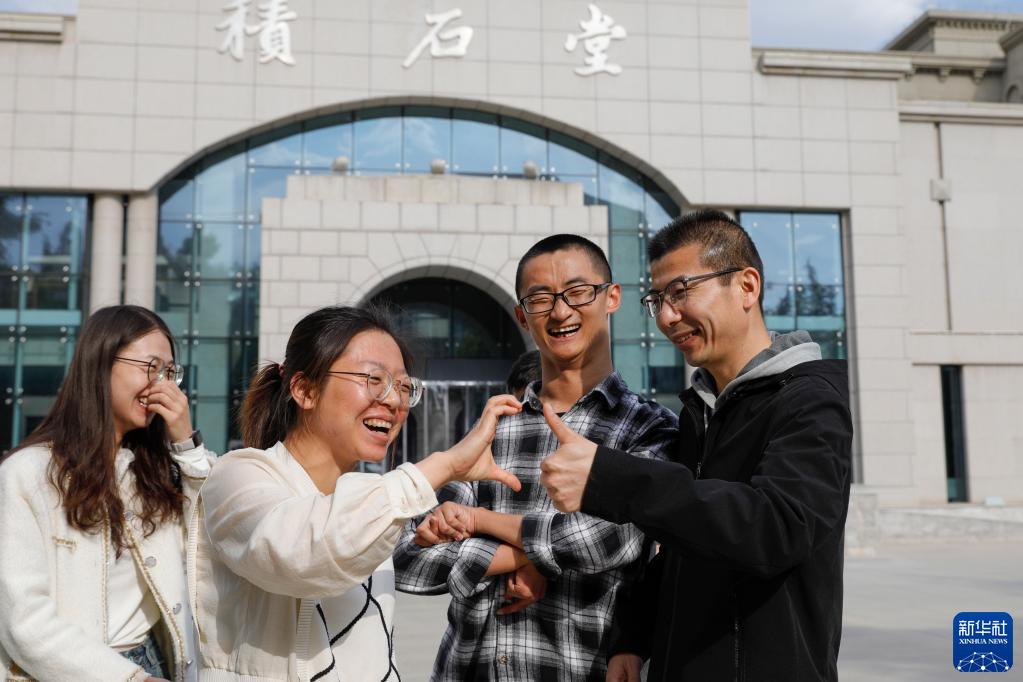 在蘭州大學(xué),謝炎廷(右二)和同學(xué)們排練“畢業(yè)”合影姿勢(5月12日攝)。新華社記者 方欣 攝