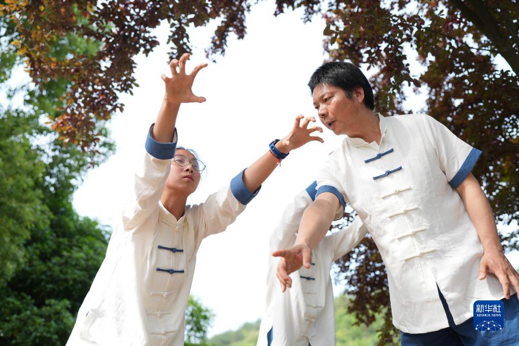 5月25日,小學(xué)生在教練帶領(lǐng)下練習五禽戲。
