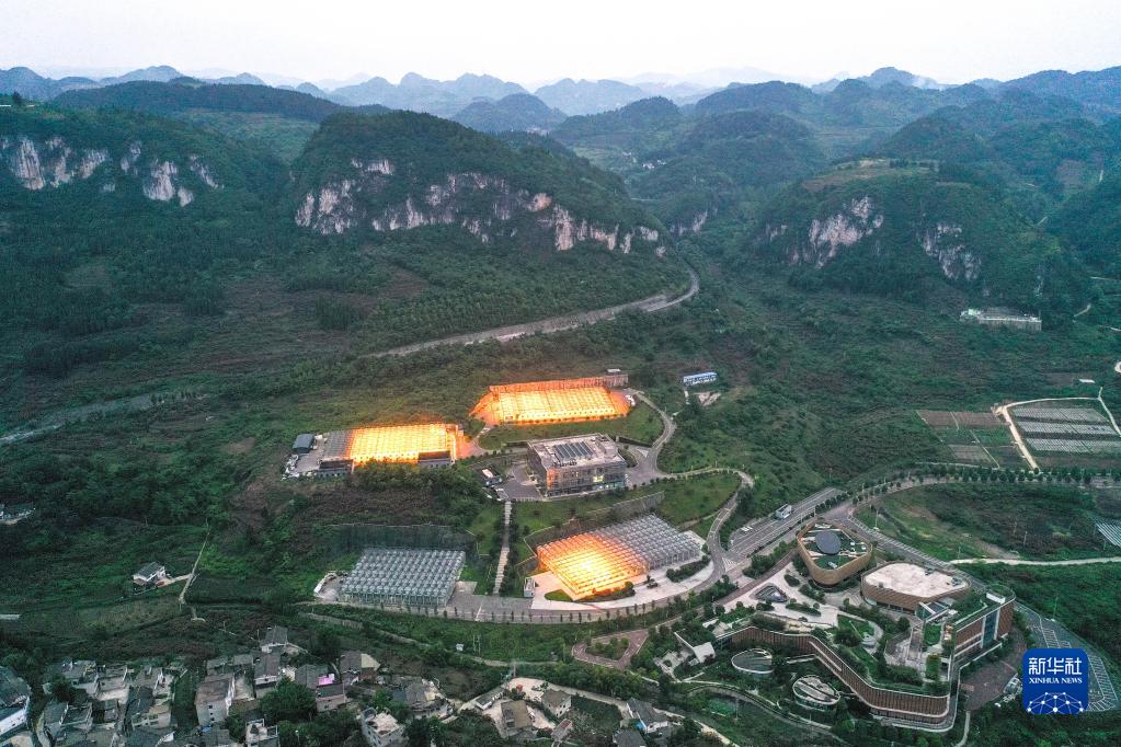 這是5月23日拍攝的貴陽(yáng)市開(kāi)陽(yáng)縣南江蔬菜良種繁育中心育苗大棚夜間補光場(chǎng)景(無(wú)人機照片)。補光更有利于種苗生長(cháng),縮短育苗周期。
