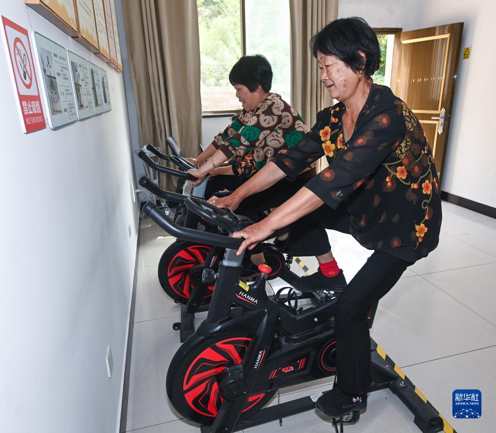 5月25日,在諸暨市姚江鎮的鎮級居家養老中心內,老人在用健身器材鍛煉身體。
