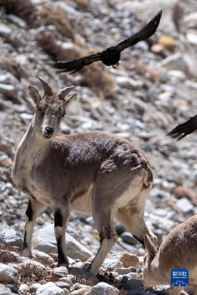 這是在珠峰國家級自然保護區內拍攝的巖羊和黃嘴山鴉(5月13日攝)。