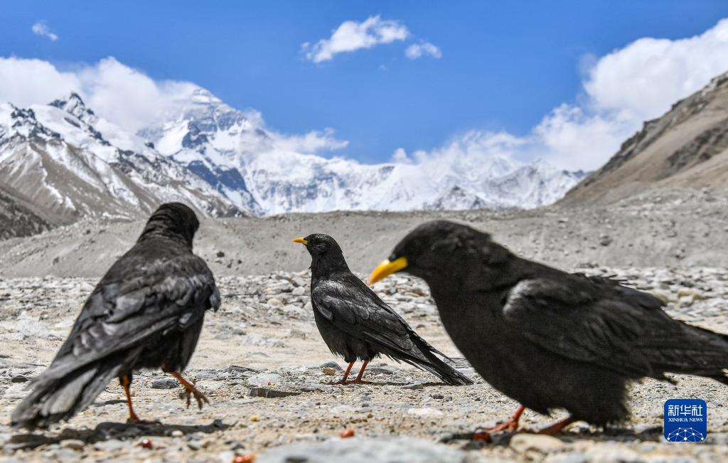 黃嘴山鴉在珠峰腳下覓食(5月14日攝)。