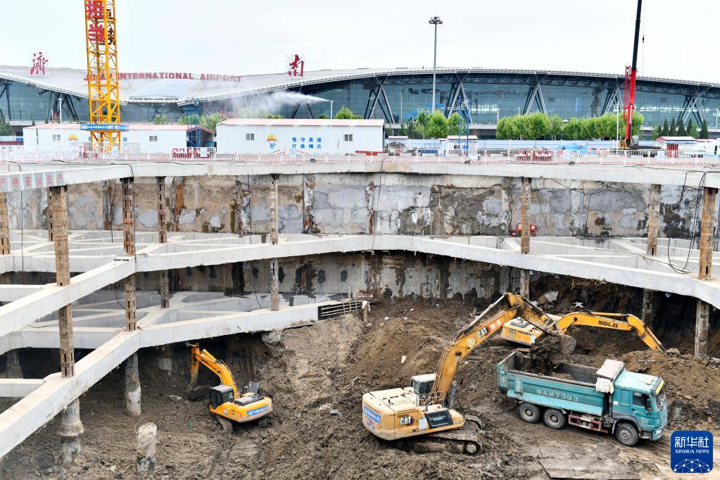 5月25日,施工人員在濟南遙墻機場(chǎng)綜合交通樞紐工程施工現場(chǎng)挖掘地鐵車(chē)站基坑。