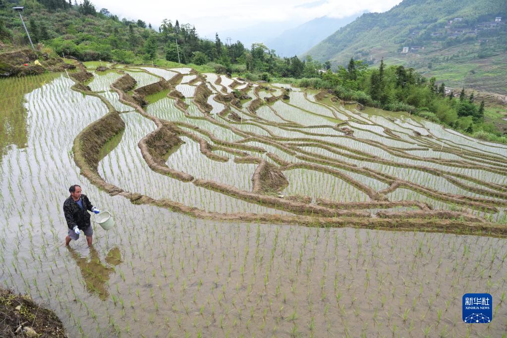 5月24日,農民在尤溪縣聯(lián)合鎮連云村一處梯田里施肥。