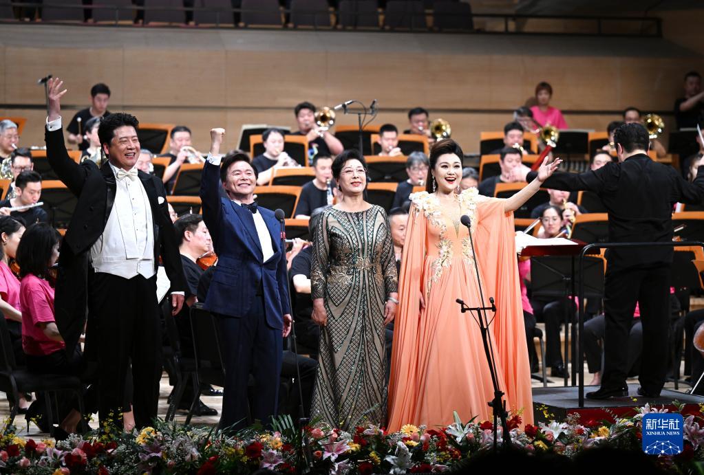5月25日,在天津大劇院音樂(lè )廳,歌唱家王澤南(左一)、王宏偉(左二)、關(guān)牧村(左三)、張晏蓉等在舞臺上演出。