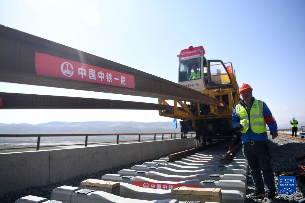 當日,在甘肅省武威市天祝藏族自治縣境內蘭(蘭州)張(張掖)三四線(xiàn)鐵路鋪軌施工現場(chǎng),一體式牽引車(chē)在中鐵一局施工人員的操作下,將一組500米長(cháng)的鋼軌精準鋪設在道床上,標志著(zhù)由中鐵一局承建的蘭張三四線(xiàn)鐵路蘭州至武威段進(jìn)入全線(xiàn)鋪軌階段。