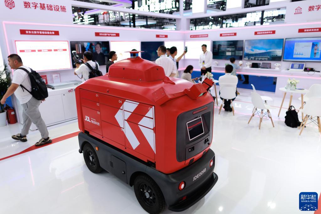 5月26日,觀(guān)眾在數博會(huì )現場(chǎng)參觀(guān)物流智能快遞車(chē)。