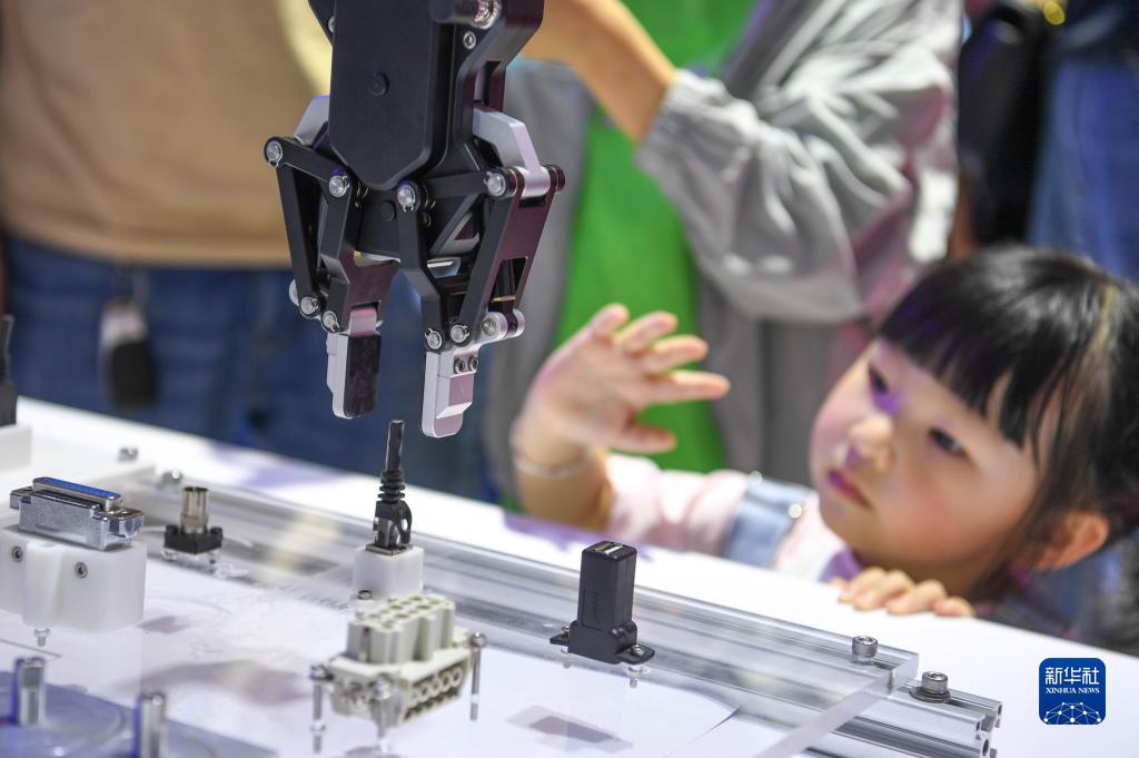 5月26日,小朋友在數博會(huì )展館參觀(guān)一款機器人演示通用零件插拔及裝配。