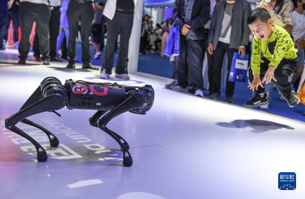 5月26日,小朋友在數博會(huì )展館內與一款智能機器狗互動(dòng)。