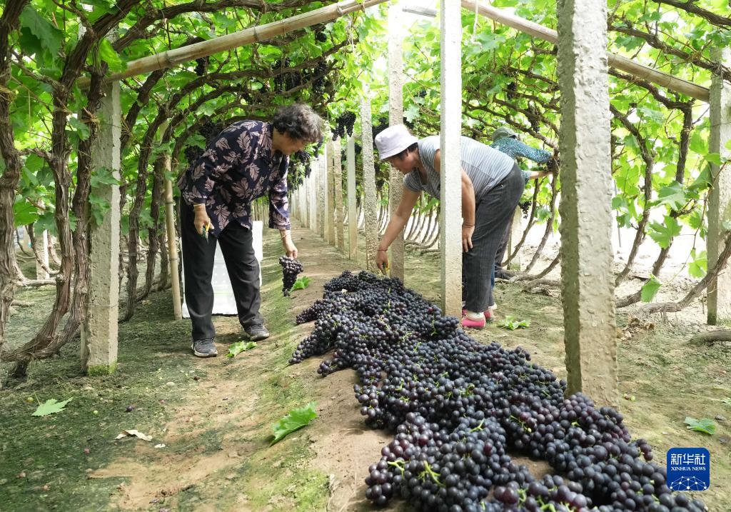 5月26日,唐山市海港經(jīng)濟開(kāi)發(fā)區王灘鎮趙灘村農民在大棚內采摘葡萄。
