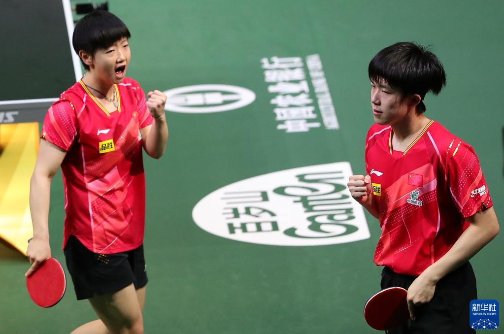 5月26日,王楚欽(右)/孫穎莎在比賽中慶祝。