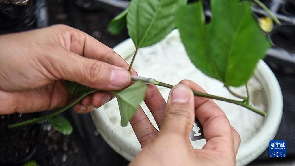 在“木瓜哥”的智能大棚內,一名村民在嫁接黃金百香果苗(5月25日攝)。