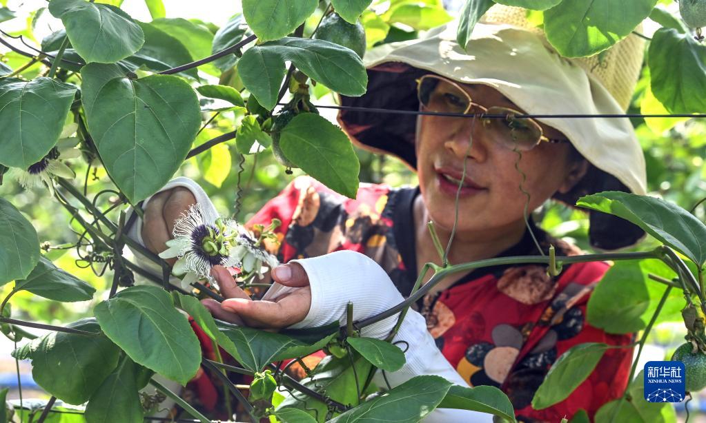 在欽州市欽南區烏雷村的黃金百香果園,欽南區水果產(chǎn)業(yè)發(fā)展中心工作人員查看百香果花(5月25日攝)。