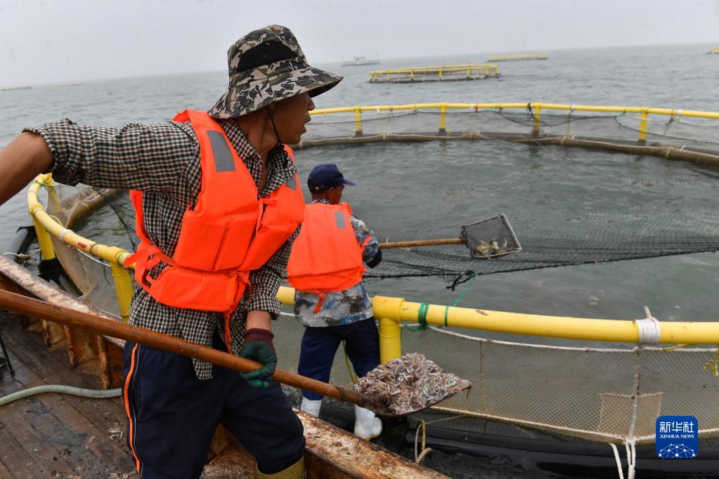 5月26日,在日照市盛隆水產(chǎn)養殖有限公司海洋牧場(chǎng),漁民在給網(wǎng)箱內養殖魚(yú)投喂小魚(yú)。