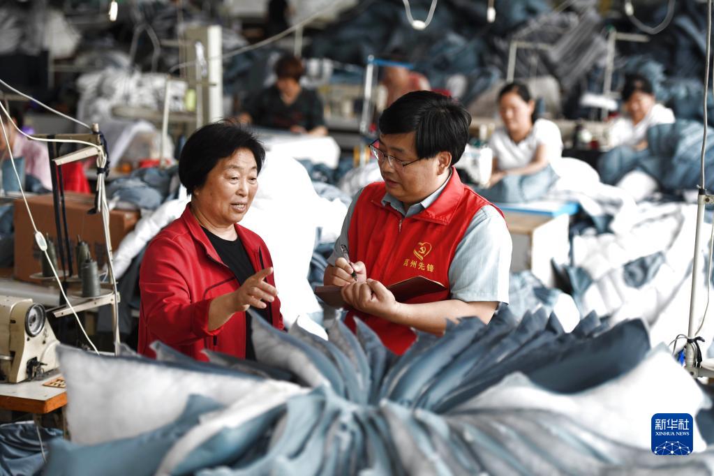 5月25日,在山東省日照市莒縣福利服裝廠(chǎng),黨建指導員潘曉青(右)向廠(chǎng)長(cháng)辛興芬了解黨支部建設和服裝銷(xiāo)售情況。
