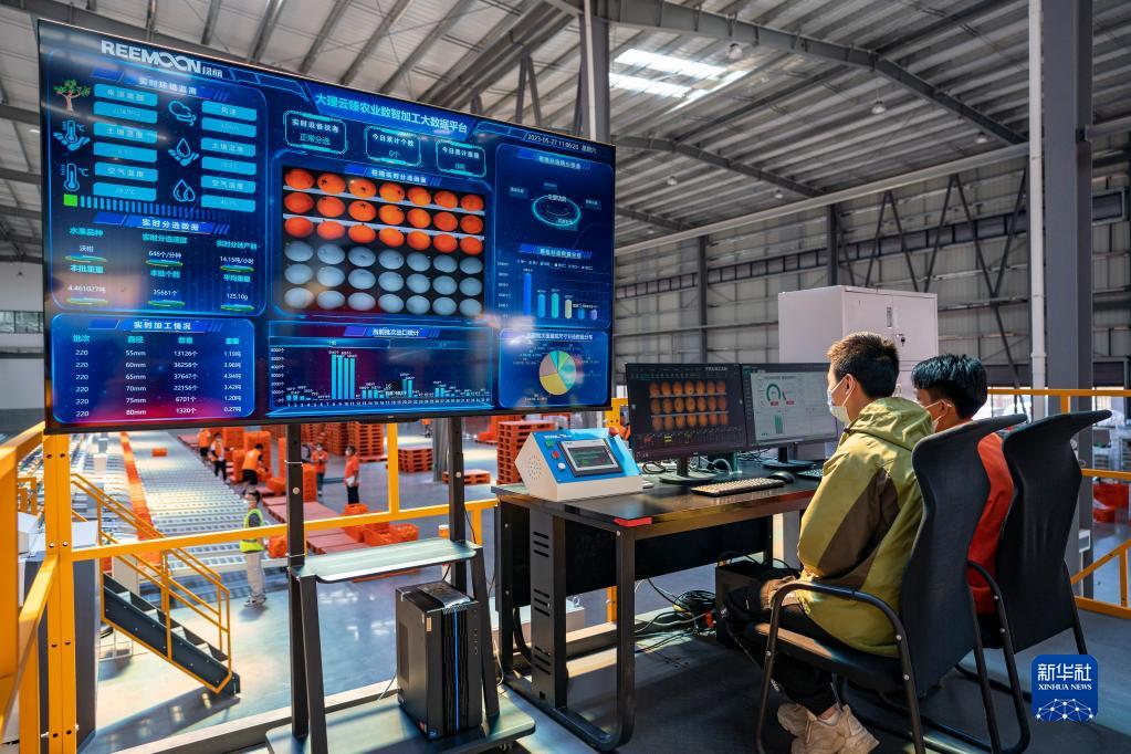 5月27日,工作人員在賓川縣一家農業(yè)企業(yè)水果分選流水線(xiàn)上監控柑桔分選。