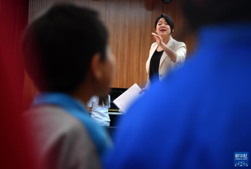 5月24日,在許昌市特殊教育學(xué)校,志愿者白一童指導盲童合唱團的團員進(jìn)行練習。