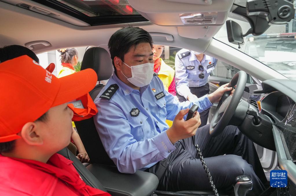 5月27日,在上海市公安局徐匯分局湖南路派出所,民警在向孩子們介紹警車(chē)中各種設備的用途。