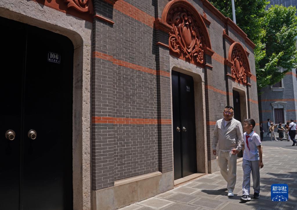 5月25日,秦鴻鈞烈士的孫子秦嶺(左)和重孫秦翊凱參觀(guān)中共一大會(huì )址。
