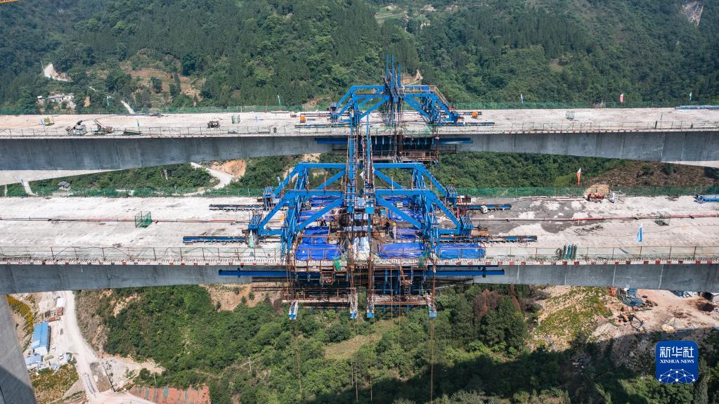 5月27日拍攝的貴金古高速清池特大橋主橋連續剛構合龍現場(chǎng)(無(wú)人機照片)。