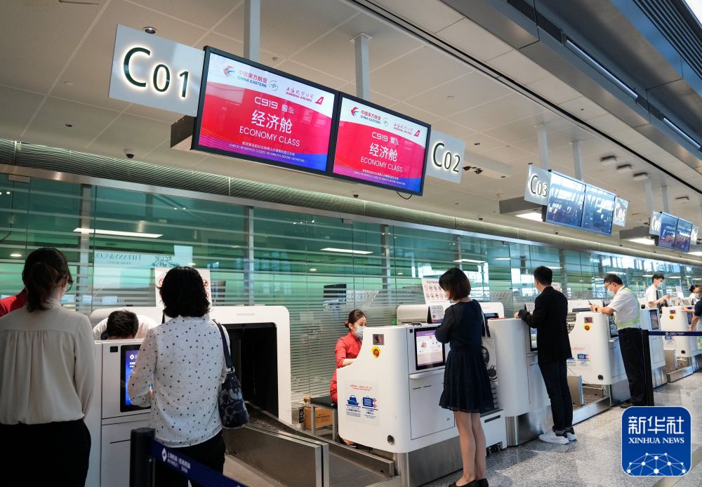 5月28日,旅客在上海虹橋國際機場(chǎng)航站樓辦理登機手續。新華社記者丁汀攝