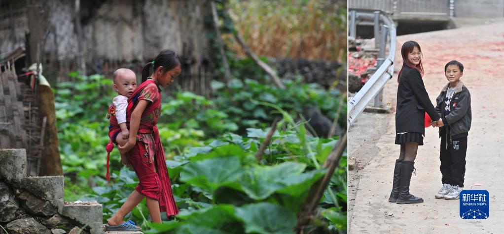 拼版照片:左圖為2012年7月16日,在大化瑤族自治縣板升鄉弄勇村,10歲的蒙柔玉背著(zhù)弟弟蒙宣朋去玩耍;右圖為2023年1月20日,在大化瑤族自治縣板升鄉弄勇村,21歲的蒙柔玉(左)和12歲的弟弟蒙宣朋在一起。已經(jīng)從幼師畢業(yè)的蒙柔玉,一邊工作,一邊學(xué)習舞蹈,為自己兒時(shí)的歌舞夢(mèng)繼續努力。