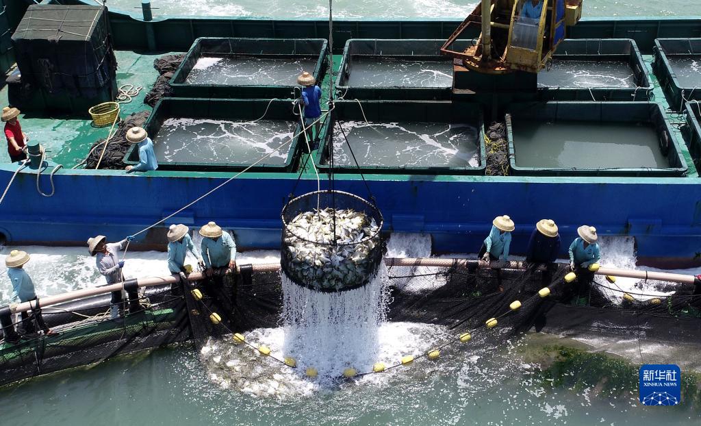 5月27日,在湛江市徐聞縣西連鎮,漁業(yè)工人從徐聞國橋深海養殖有限公司的金鯧魚(yú)深海網(wǎng)箱捕魚(yú)(無(wú)人機照片)。