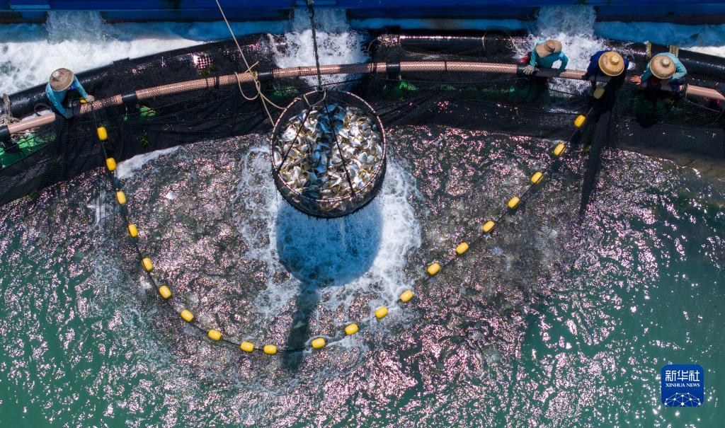 5月27日,在湛江徐聞西連鎮,漁業(yè)工人從深海網(wǎng)箱中打撈金鯧魚(yú)(無(wú)人機照片)。