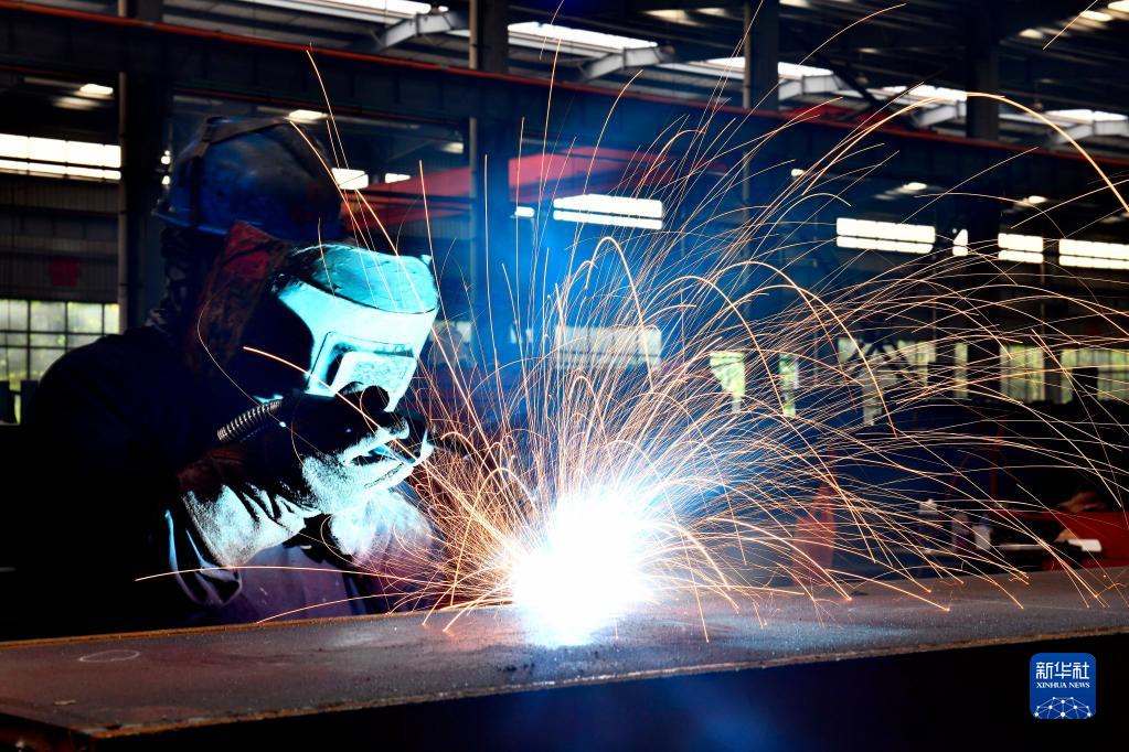 5月28日,在嘉祥縣國家級裝配式建筑產(chǎn)業(yè)園,工人在焊接裝配式鋼結構框架。