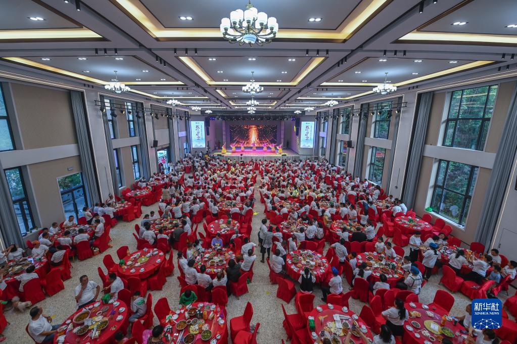 5月27日,梅坪村的村民在新建成的文化中心內的村文化禮堂,參加百家宴并觀(guān)看文藝演出。