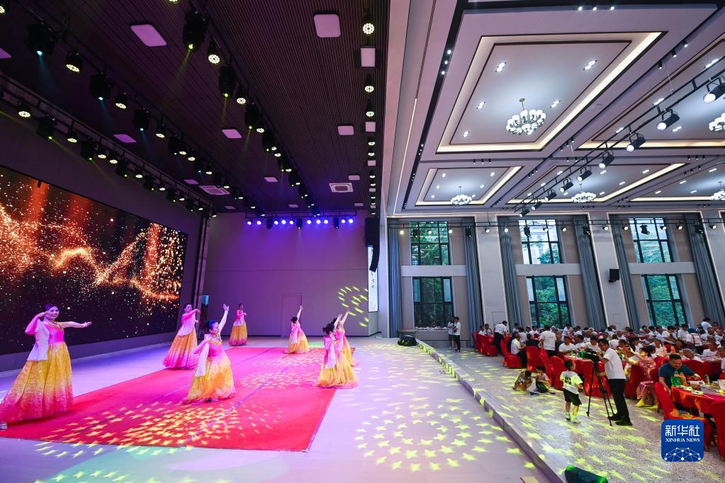 5月27日,梅坪村的村民在新建成的文化中心內的村文化禮堂參加百家宴并觀(guān)看文藝演出。